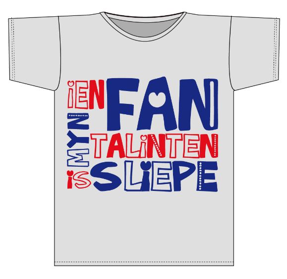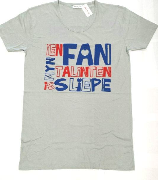 Heerlijk lang shirt 1 maat, grijs Fries nachtshirt met opdruk: Ien fan myn talinten is sliepe! (één van mijn talenten is slapen) En uitslapen mag uiteraard. One size fits all! 1 maat, dus past altijd. Heerlijk ruim vallend shirt, ook verkrijgbaar in het blauw. Zeer geschikt als cadeau of lekker voor jezelf.