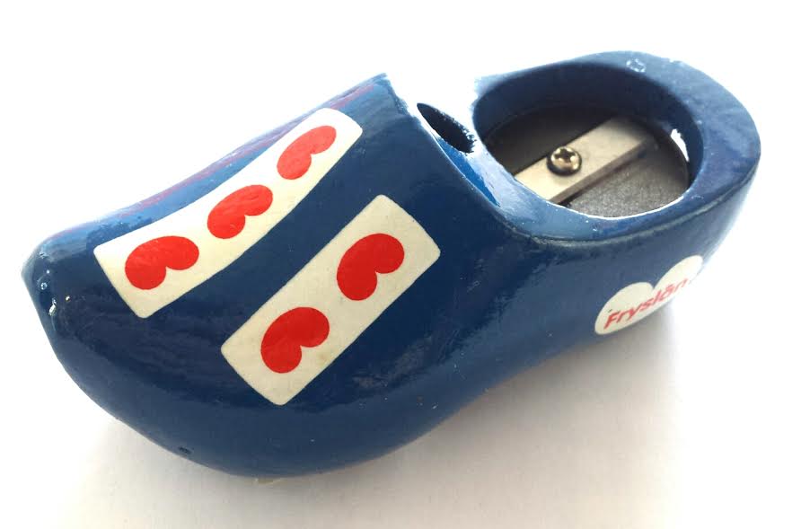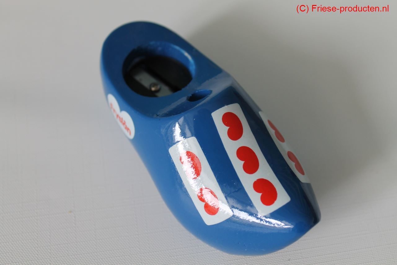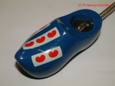 Fries klompje met daarin een puntenslijper en ruimte om een potlood in te zetten. Afmeting klompje = 8,5 cm lang