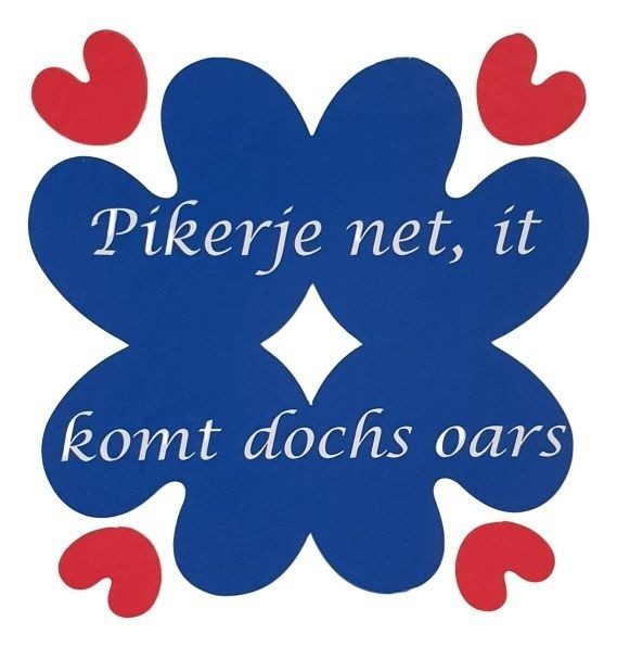 Mooie moderne spreuksticker opgebouwd uit pompeblêden met Friese tekst: Pikerje net it dochs oars. Deze sticker is uitgevoerd met dubbele beschermingsfolie, zodat deze zeer gemakkelijk heel netjes op te plakken is en geschikt voor buitengebruik. Afmeting is zo’n 10×10 centimeter.