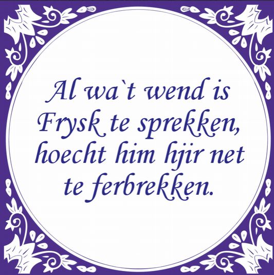 Nieuw! De klassieke Friese tegeltjes met spreuken. Op deze tegel staat de spreuk: Al wa’t wend is Frysk te sprekken hoecht him hjir net te ferbrekken. (Iemand die gewend is Fries te spreken hoeft dat hier niet te verbreken)