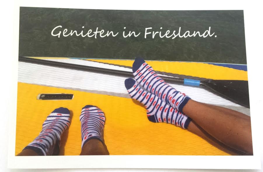 Ansichtkaart met Friese afbeelding watersport en de tekst: Genieten in Friesland