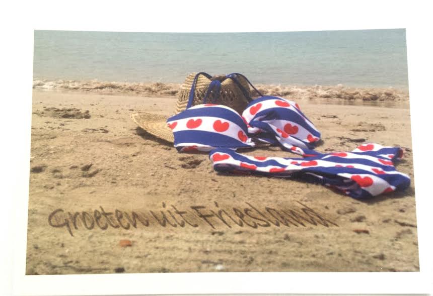Ansichtkaart met Friese hoed en bikini en tekst: Groeten uit Friesland