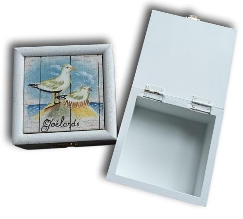 Houten bakje voorzien van mooi geschilderd strand met meeuwen afbeelding. (11,8 x 11,8 x 6,4 cm)