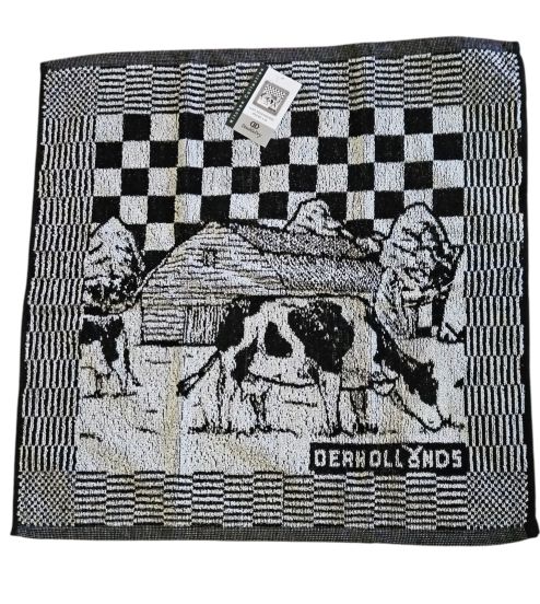 Mooie keukendoek met boerderij en koeien. Deze luxe zwart-witte keukendoek is 50 x 50 cm, 100% katoen. Er is ook een bijpassende theedoek met deze print.