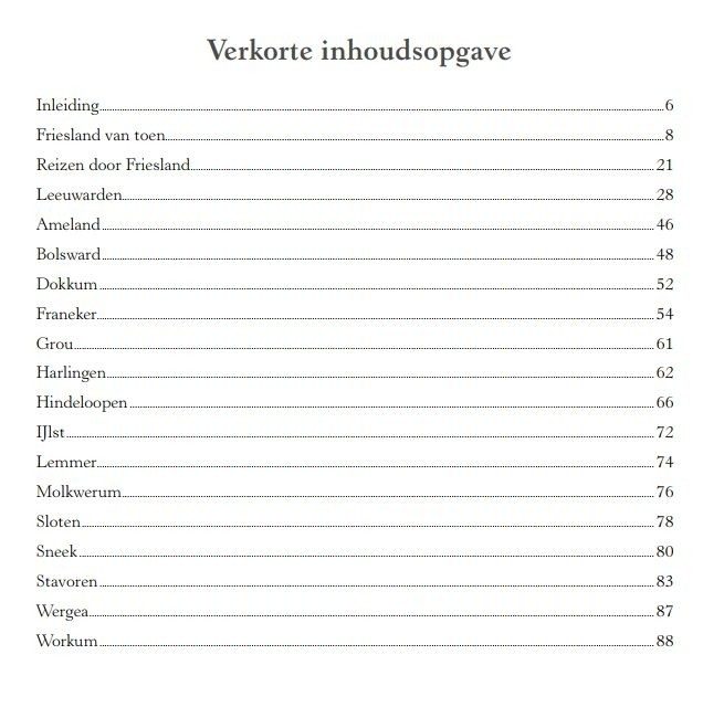 De bezienswaardigheden en monumenten van Leeuwarden en de andere steden/dorpen komen breed aan bod. Met verwijzing naar plaatselijke musea – groot en klein – en bezoekerscentra. In een apart hoofdstuk gaat het over ‘Friezen van toen’ met aandacht voor onder meer het karakter van de Friezen, het schaatsen, de Friese meisjes en hun oorijzers, het kettingroken, de Elfstedentocht en de rijkdom van Friese boeren.