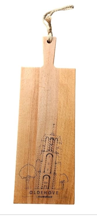 Nieuw in ons assortiment is deze prachtig gegraveerde Leeuwarder beukenhouten snijplank (rechthoek). (zware kwaliteit, 900 gram!) Deze Leeuwarden plank is voorzien van gegraveerde Oldehove afbeelding en heeft een afmeting van 38,8 x 16,8 cm en voorzien van ophangtouwtje.