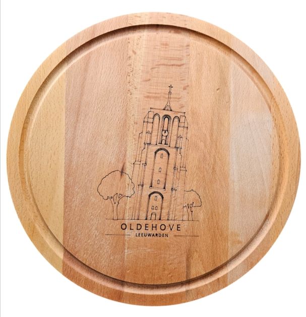 Nieuw in ons assortiment is deze prachtig ronde gegraveerde Leeuwarder beukenhouten snijplank. (zware kwaliteit, 990 gram!) Deze Leeuwarden plank is voorzien van gegraveerde Oldehove afbeelding en heeft een doorsnede van 29,6 centimeter.