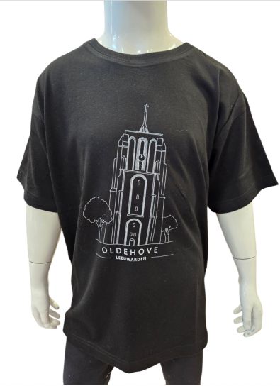 Nieuw! Oldehove Leeuwarden t-shirt in zwart met strakke tekening van de bekendste toren van Leeuwarden: de Oldehove.