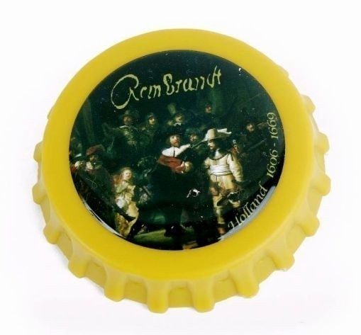 Magnetische flesopener (geel) met de Nachtwacht van Rembrandt van Rijn