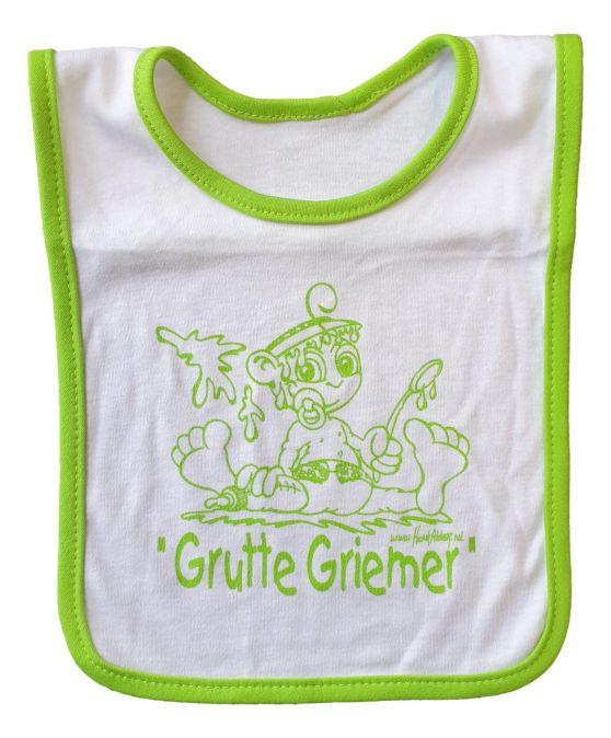 Friese slab. Erg leuk babycadeau, dit slabbetje met groene bies en opdruk Grutte Griemer.  Mooi groot formaat en netjes omgezoomd.