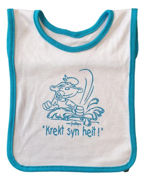 Friese slab. Erg leuk babycadeau, dit slabbetje met blauwe bies en opdruk Krekt syn Heit. Mooi groot formaat en netjes omgezoomd.