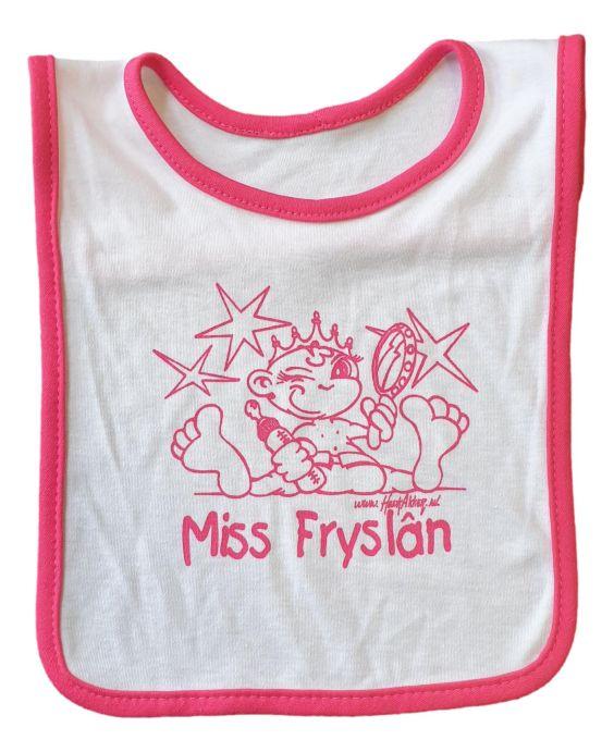 Friese slab. Erg leuk babycadeau, dit slabbetje met roze bies en opdruk miss Fryslân. Mooi groot formaat en netjes omgezoomd.