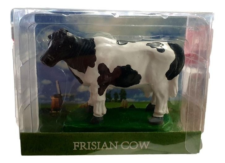 Polystone zwart/witte koe staand model op groene voet, afmeting 9,5 cm en 7 cm hoog.