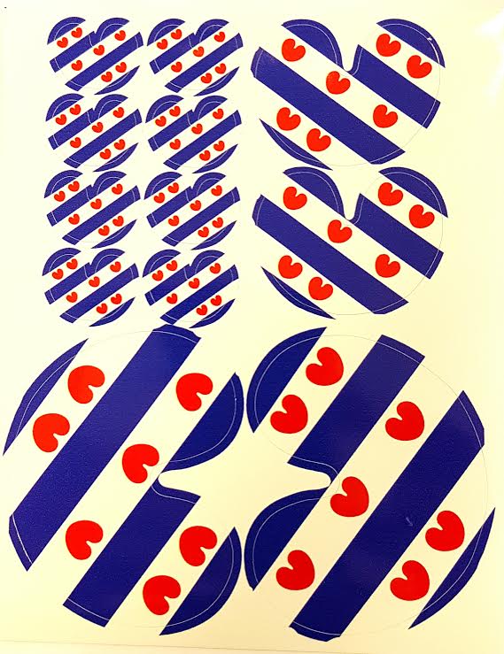 Friese pompeblêden in 3 verschillende maten op 1 stickervel met afbeelding Friese vlag. Zo heb je altijd een passende oplossing.