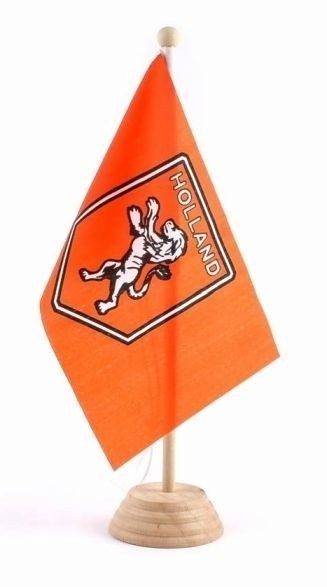 Kant en klaar complete tafelvalg inclusief houten standaard met oranje vlaggetje en tekst Holland en afbeelding leeuw.