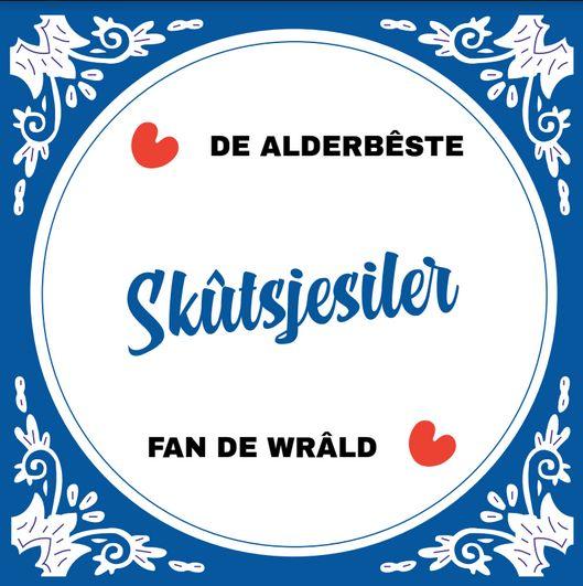 Tegel voor aan de muur, voor de alderbêste skûtsjesiler. Deze tegeltjes zijn leuk om te geven en worden erg gewaardeerd om te krijgen. Ook verkrijgbaar als mok.