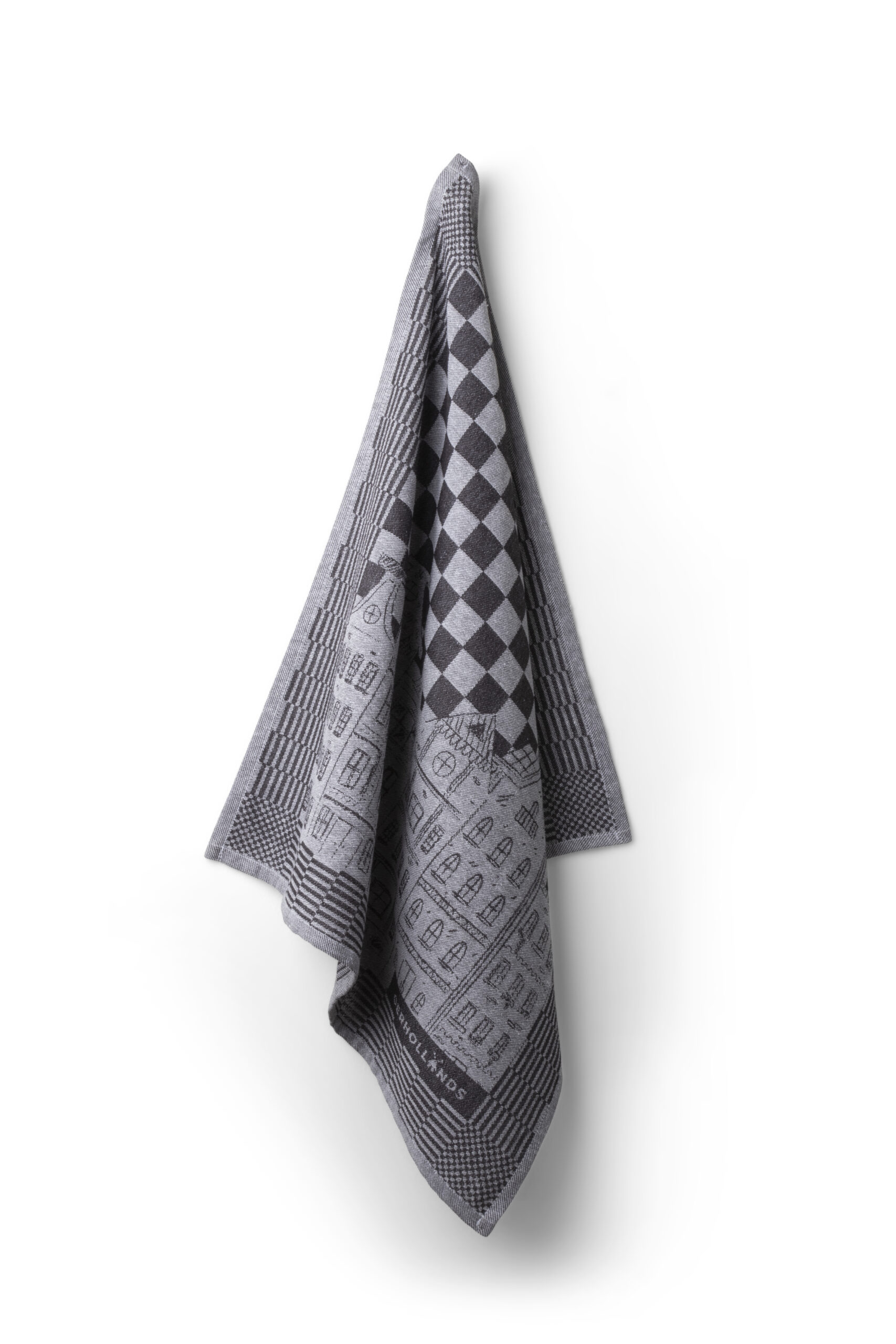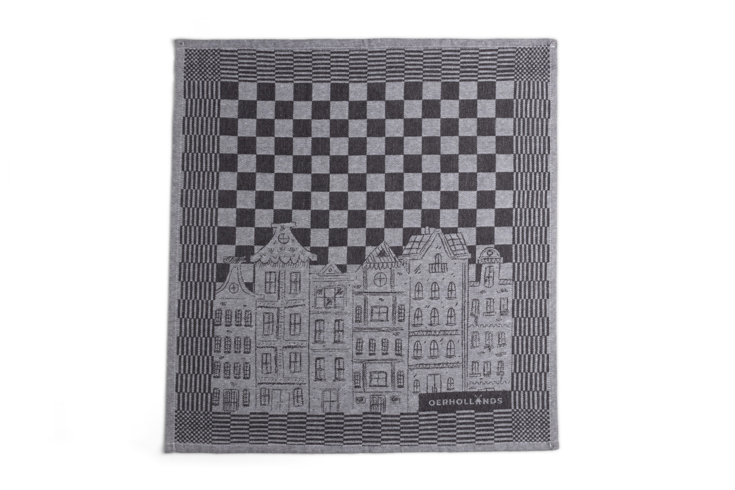 Mooie theedoek met herenhuizen in zwart wit uitvoering. Deze luxe theedoek is 50 x70 cm, 100% katoen.
